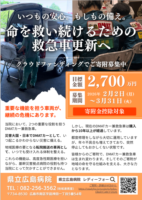 県立広島病院において、災害医療や救急医療に使用するDMATカー調達のためクラウドファンディングを実施しています。